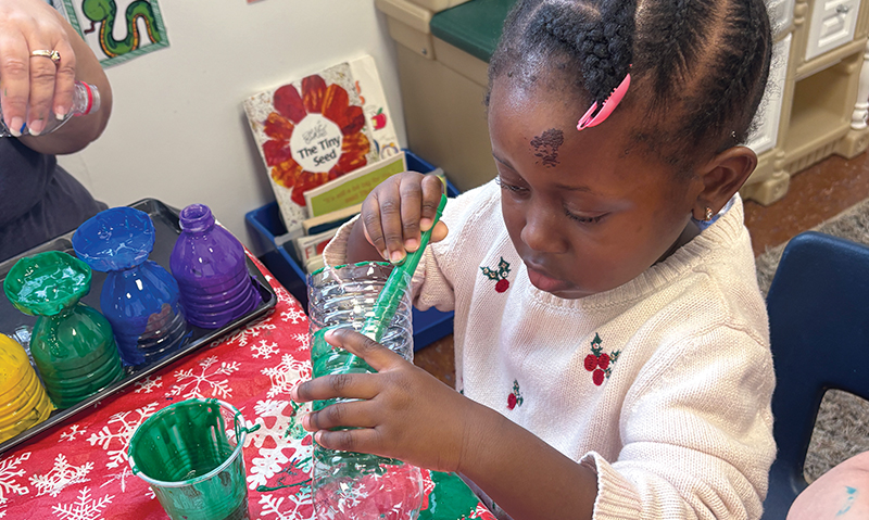 “They were exposed to new vocabulary words and science concepts, such as absorption (the sponge absorbs/sucks up the water from the pulp), inside and outside (painting bottles), mixing paint colors to make other colors. They loved making brown!” Jo Ann shared.